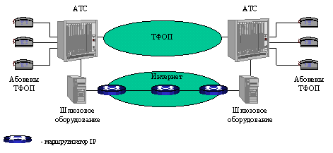 Третий сценарий определяет взаимодействие двух абонентов ТФОП, пользующихся только телефонными аппаратами, при этом сеть Интернет используется как транспортная среда между узлами коммутации ТФОП.