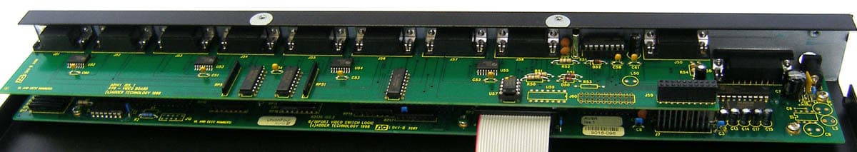 На верхней плате — коммутаторы для интерфейса VGA, маркировка малоразборчива. Конденсаторов не очень много, да и в целом логика достаточно простая. Основу устройства составляют три большие микросхемы на нижней плате, одна из них отвечает, по всей видимости, за общую организацию процесса, а две другие с одинаковой маркировкой — за четыре канала из восьми, если вспомнить о наличии четырёхпортовой модели. Маркированы они наклейками, надписи типа Adder «B» Processor указывают на собственное производство, на своих мощностях или на заказ — в наше время значения не имеет. Резюме простое — заявление о самостоятельной разработке подтверждено полностью. Снять верхнюю плату мы не решились, потому что она крепится к корпусу на 18 винтов (около разъёмов), и сохранить им всем товарный вид могло и не получиться. Некоторые признаки на печатных платах позволяют предположить, что эти же используются в других устройствах в качестве модулей конструкции. И, наконец, на третьей плате, сразу за передней панелью, смонтированы светодиоды и кнопка подключена к нижней шлейфом. Монтаж везде аккуратный.