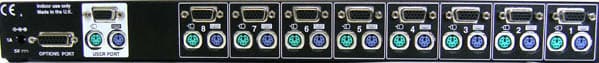 Все разъёмы для коммутации находятся на задней панели, это VGA и два PS/2 на каждый канал и для консоли. Кроме того там же гнездо для кабеля блока питания и Option Port, по существу — RS-232, но не совместимый ни с DB-9, ни с DB-25. Выше мы сказали, что ножек не было в комплекте. Оказалось, что они уже наклеены. Маленькие ножки, из чёрной резины, со своими обязанностями справлялись хорошо.