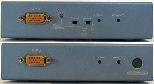 На обеих находятся разъёмы для подключения к ПК VGA и PS/2, и также VGA-подобный комбинированный разъём для консоли с противоположной широкой стороны. Сзади входы для питания и разъём RJ-45 для соединения блоков между собой. Спереди, рядом с разъёмом консоли, индикаторы активного в данный момент блока и органы управления. На локальном кнопка выбор активной консоли (автомат, эта или противоположная перебором). На удалённом ползунок выбора «горячей клавиши», Ctrl или ScrLock, и такой же ползунок переключения между ручной и автоматической регулировкой уровня мощности сигнала. Ручная подстройка производится отвёрткой с тонким шлицем.
