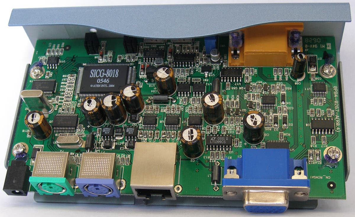 Из интересных моментов стоит отметить фирменный ASIC Aten SICG-8018, LT1399CS от Linear Technology усилитель видеосигнала, пара программируемых микроконтроллеров PIC16LF73I от Microchip со встроенной флэш-памятью и RISC-процессором.