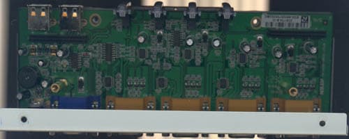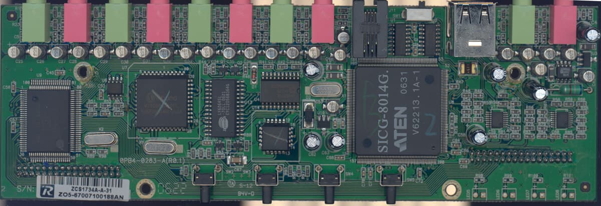 На верхней плате коммутаторы для других интерфейсов, также производства Philips, конденсаторы для буферизации интерфейсов в целях безопасного «горячего» подключения и управляющие ASIC производства самой Aten и Winbond. Монтаж аккуратный (по ссылке картинка 221 КБ).