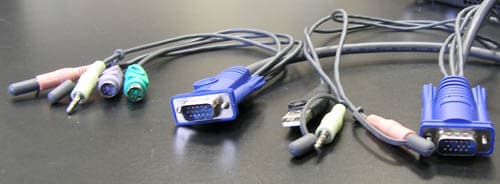 Кабели для подключения ПК содержат на стороне, подключаемой к KVM стандартный разъём VGA (d-Sub) и 2 стереоджека, а на стороне ПК ещё или USB разъём, или 2 коннектора PS/2, в зависимости от модификации. Таким образом использования стандартных кабелей невозможно, придётся применять фирменные. Провода средней толщины, все сигналы «живут в одном доме», однако на качестве это не сказывается.