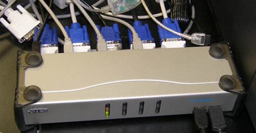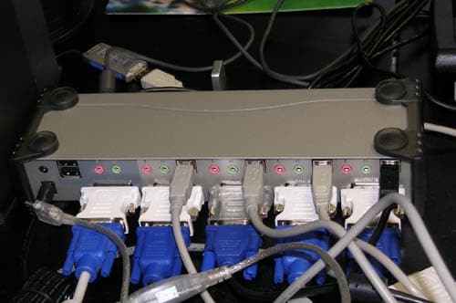 После контроля качества в штатном режиме эксплуатации возникла мысль поработать с устройством подольше. Видеокарта с разъёмом DVI у меня на работе всего одна, находится в моей рабочей машине, а на стенде бывает много всяких разных ПК и серверов без DVI интерфейса. Поэтому тестовый прогон был сделан с ещё одной видеокартой с интерфейсом DVI, любезно предоставленной моими друзьями. Затем с применением 5 переходников DVI-to-VGA, 5 обычных VGA кабелей, 5 абсолютно стандартных USB A-B кабелей и 3 аудиокабелей была собрана рабочая конфигурация, которая и эксплуатировалась в течении примерно месяца.