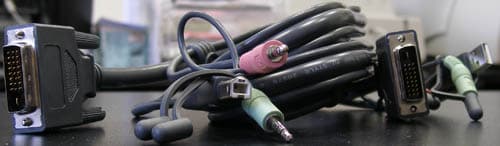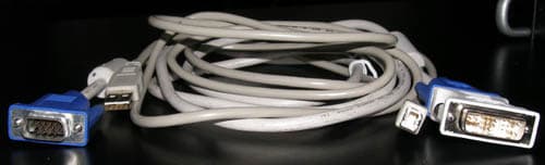 Кабели для подключения ПК содержат 3 отдельных шнура, объединённых вместе изоляцией: USB, он же мышь и клавиатура (все 4 возможных устройства используют один порт компьютера), звуковой с двумя миниджеками с каждого конца и DVI I+A Dual Link, в котором разведены все контакты, предусмотренные стандартом. Провода достаточно толстые и качественные, гнутся с некоторым трудом.
