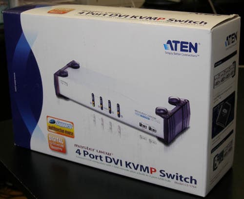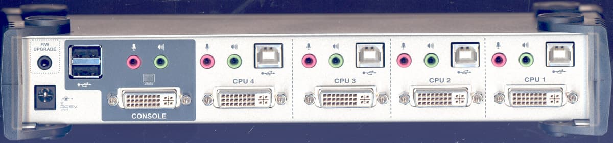 CS-1764 четырёхпортовый переключатель консоли, предназначенный для использования с клавиатурой и мышью с USB подключением и монитором и видеокартами с интерфейсом DVI. Кроме того коммутируется USB хаб на 2 устройства и по 2 стереоканала звука на каждый системный блок. Фокус консоли, USB и звука переключается по разным ПК независимо друг от друга. В ассортименте предложений компании имеется аналогичный KVM на 2 системных блока. Теперь подробнее.