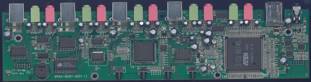 На верхней плате коммутаторы для других интерфейсов, также производства уважаемой европейской компании Philips, конденсаторы для буферизации интерфейсов в целях безопасного «горячего» подключения и управляющие ASIC производства самой Aten и Winbond. Монтаж аккуратный (по ссылке картинка 184 КБ).