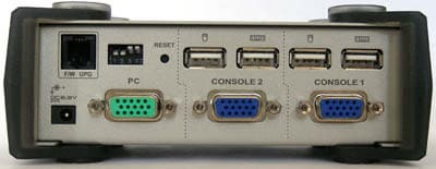 Изделие рассчитано на подключение двух комплектов клавиатур и мышей с интерфейсом USB и двух мониторов с интерфейсом VGA. Со стороны ПК поддерживаются как PS/2, так и USB системные блоки. Разберёмся подробнее.