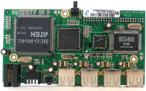 Сверху целых три программируемых микроконтроллера ASIC: Winbond W78E065A4OPL и собственного производства Aten SICG-8014G и SICG-8018 (которые используется только производителем и спецификации не опубликованы). Монтаж аккуратный.