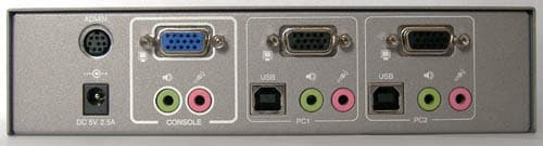 В рамках нашего движения от простого к сложному начнём с простейшей модели, предназначенной для управления двумя компьютерами с интерфейсом клавиатуры и мыши PS/2 при помощи мыши и клавиатуры с интерфейсом USB. Видеостандарт VGA. Кроме того коммутируется USB 2.0 хаб на 2 устройства и по 2 стереоканала звука на каждый системный блок. Фокус консоли, USB и звука переключается по разным ПК независимо друг от друга. В ассортименте предложений компании имеется аналогичный KVM на 4 системных блока. Теперь подробнее.