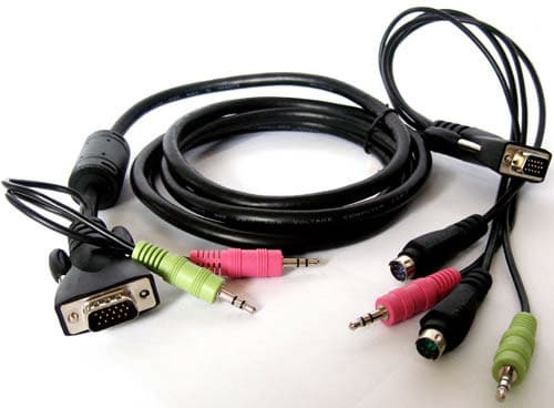 Кабель единый, со стороны KVM ферритовый фильтр, разъём, похожий на d-Sub и отходящие от него два аудиоджека на коротких отростках. Со стороны ПК разъём VGA, от него на двадцатисантиметровых проводках два аудиоразъёма и два PS/2.