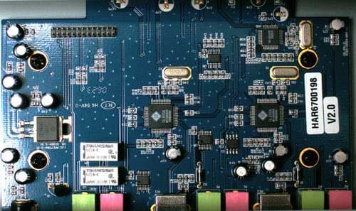 На нижней два интегрированных с RISC-процессором USB 2.0 хаба от Genesys Logic GL850 A, которые скорее всего ответственны и за консоль, и за хаб. Также два реле Takamisawa NA5 W-K, коммутирующие звуковые тракты. Из-за них при переключении каналов и начальной загрузке из колонок слышны щелчки. А ещё электронные коммутаторы от Philips и конденсаторы для буферизации интерфейсов. На маленькой плате за передней панелью кнопки и светодиоды. Монтаж аккуратный, платы соединены гибкими шлейфами.