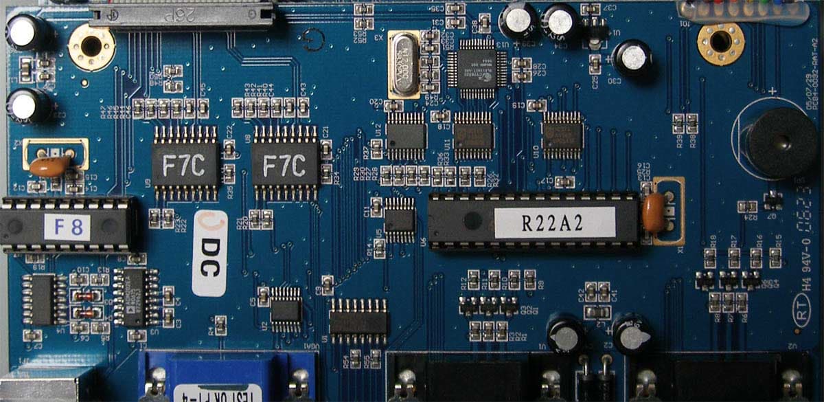 Устройство легко разбирается (и так же легко и без потерь собирается обратно), поэтому удалось рассмотреть его внутренний мир. Монтаж на двух печатных платах, в корпусе они размещены просторно и не должны перегреваться. На верхней в основном электронные коммутаторы для VGA, маркировка без микроскопа не видна, но все они от Philips. На двух больших микросхемах даже после удаления наклеек маркировку разобрать не удалось, но скорее всего, это управляющие ASIC собственного или заказного производства, а искать документацию к таким процессорам, не продаваемым на открытом рынке, обычно бессмысленно. В пользу этой версии говорит то, что начинается маркировка с букв PIC, что означает программируемый контроллер (по ссылке картинка 124 КБ).