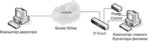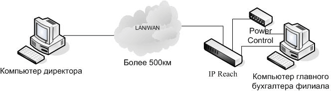 1) В нашей практике был интересный случай применения однопортового ІР KVM-удлинителя. Руководитель одного предприятия хотел ежедневно отслеживать ВСЮ информацию на компьютере главного бухгалтера харьковского филиала. Нами было поставлен IP Reach вместе с Power Control (устройством, которое позволяет дистанционно подавать и прекращать подачу питания) и подключен согласно рис.3. В результате – руководитель по мере необходимости мог с помощью IP Reach самостоятельно удаленно запустить машину и осуществить необходимый ему мониторинг.