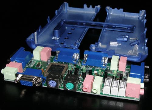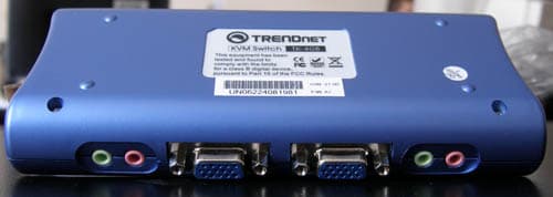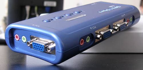 Небольшая лёгкая коробочка выполнена из тёмно-синего пластика среднего качества. Нижняя поверхность ничем не нагружена (даже резиновыми ножками или отверстиями для крепления), на остальных расположены: на передней — разъёмы для подключения консоли, колонок и микрофона, на задней — разъёмы для подключения двух клиентов, на боковых — ещё по одному, сверху четыре кнопки переключения каналов с индикаторами и светящаяся красным цветом надпись «KVM Switch».