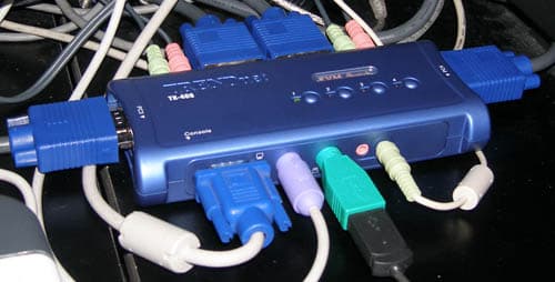 По рассмотрению нескольких KVM разного уровня от Aten обратим внимание на продукцию компании TRENDnet, и начнём с четырёхпортового KVM TK-408K, предназначенного для использования с клавиатурой и мышью с PS/2 подключением и монитором, и видеокартами с интерфейсом VGA. Кроме того коммутируется по два стереоканала звука на каждый системный блок. Фокус консоли и звука переключается по разным ПК независимо друг от друга, управление при помощи «горячих клавиш» и кнопок на устройстве.