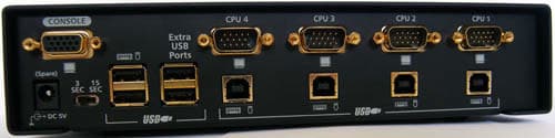 Разъёмы для коммутации устройств и для консоли находятся на задней панели. На каждый канал по VGA и USB, два консольных USB для клавиатуры и мыши, два для хаба. Также VGA для консоли, вход для дополнительного питания (адаптера в комплекте нет) и ручной переключатель задержки при автосканировании каналов: 3 или 15 секунд задержки на каждом. Все разъёмы золочёные.