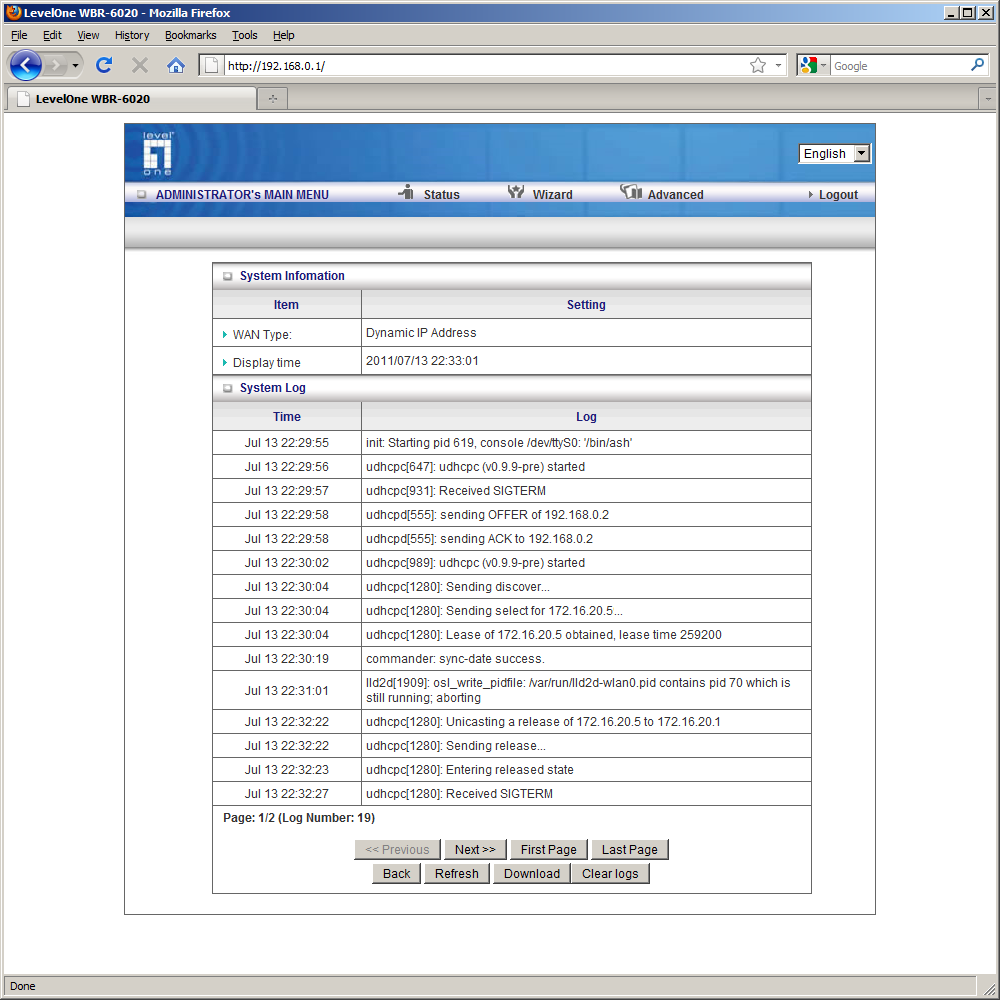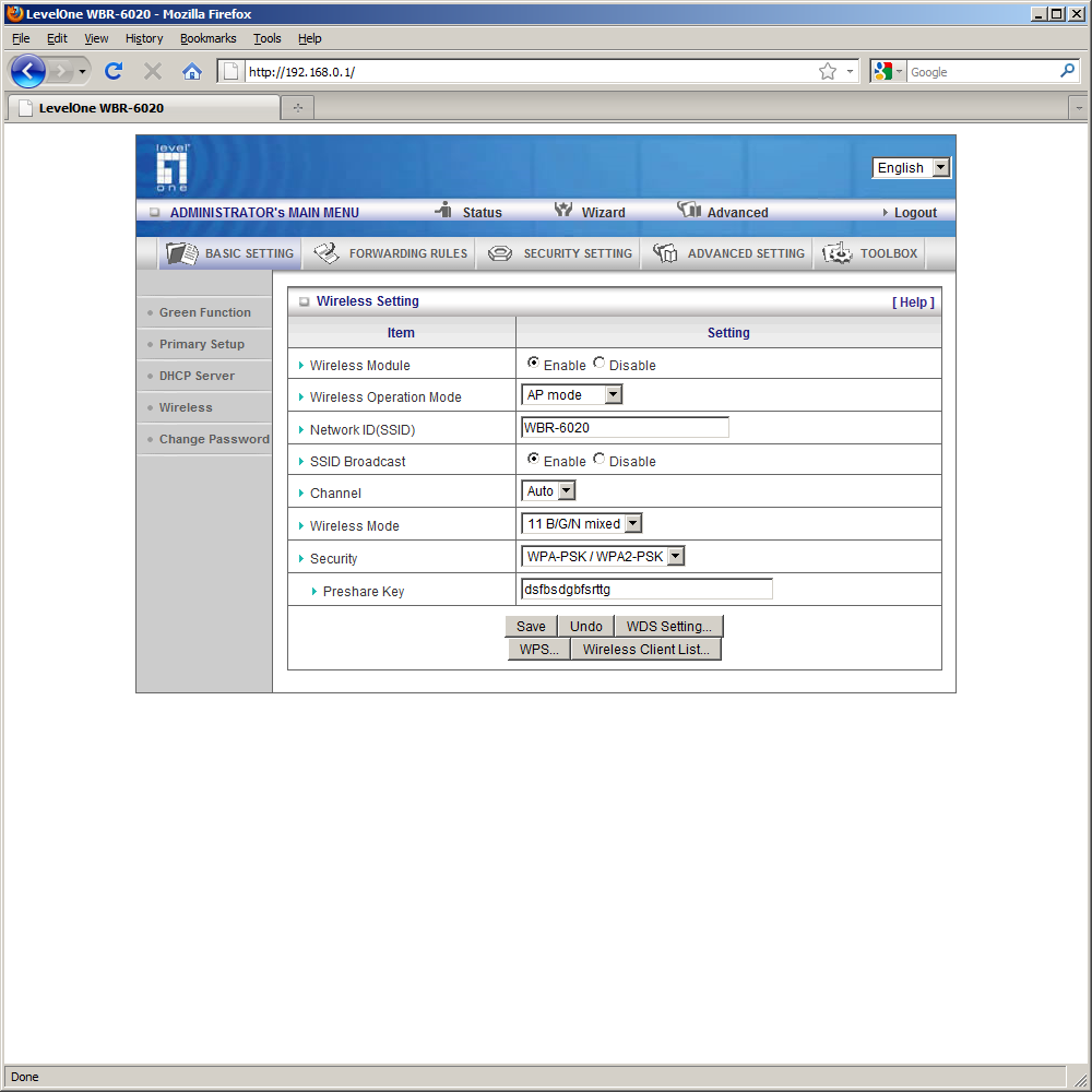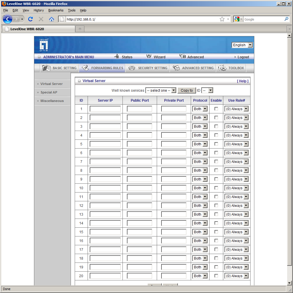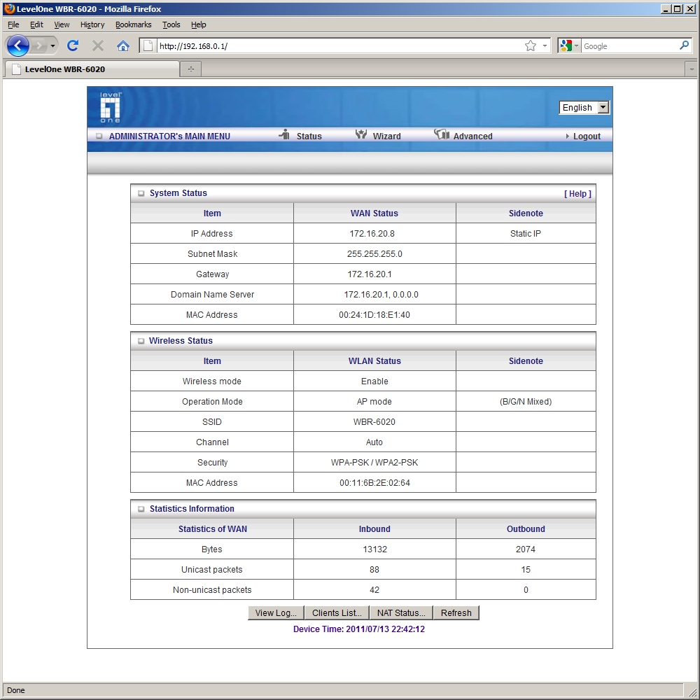 Для полного управления функциями WBR-6020 нужно использовать web-интерфейс. Русской версии у него, к сожалению, нет. Интересной особенностью является отображение на первой странице интерфейса текущей информации по подключениям и статистике. Она доступна даже без ввода пароля.
