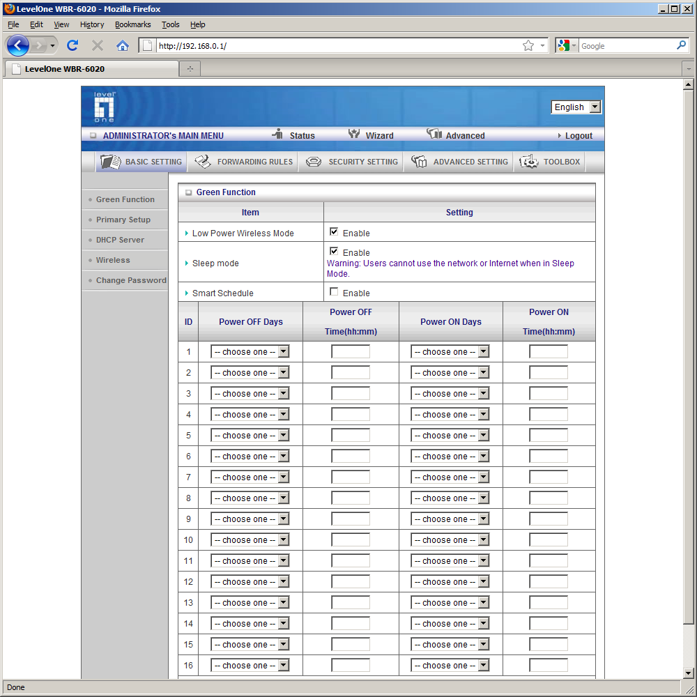 «Basic settings» отвечает за настройки «зеленого режима» и сетевых подключений. Роутер позволяет запрограммировать время своей работы с точностью до минуты. Допускается указание до 16 интервалов. Специальная опция «Smart Schedule» перед запланированным выключением проверяет наличие подключенных клиентов, и в случае их обнаружения выключение откладывается. Еще одной функцией по экономии энергии является перевод беспроводного модуля в режим пониженного потребления в случае отсутствия трафика.