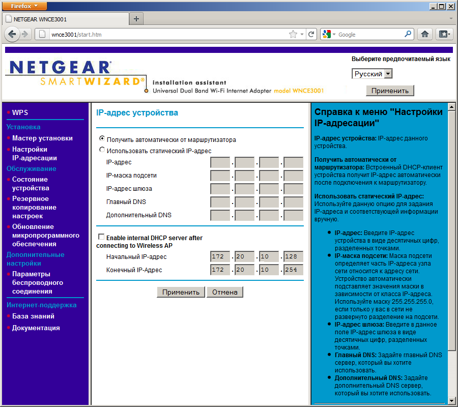 Обычно адаптер получает IP-адрес от роутера, к которому подключается, но можно указать его и в ручном режиме. Также на странице «Настройки IP-адресации» включается локальный сервер DHCP, который может использоваться для раздачи адресов клиентам. Подсеть у него совпадает с используемой в локальной сети, а диапазон можно изменить.