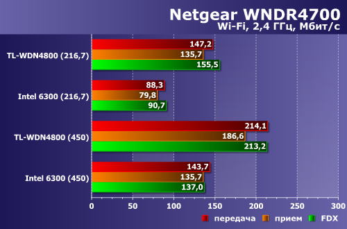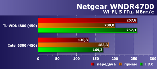 Использование чипа той же серии, что и в радиоблоке роутера, позволило TL-WDN4800 показать в тестах на 5 ГГц уникально высокий результат — почти 260 Мбит/с на прием и 200 Мбит/с на передачу. Это еще раз подтверждает, что сегодня Qualcomm/Atheros AR9380 является наиболее привлекательным решением для беспроводных контроллеров. Интересно, увидим ли мы когда-нибудь аналогичные результаты в мобильных устройствах? А вот адаптер Intel немного огорчил, хотя результат в 100 Мбит/с и более сегодня выглядит очень неплохо.