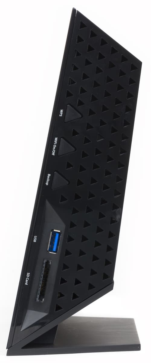 На правом краю нашлось место для трех кнопок — WPS, выключение Wi-Fi, запуск резервного копирования. Немного ниже находится второй порт USB 3.0 и слот для карт памяти с поддержкой форматов SD/SDHC, MMC, MS и MS Pro.