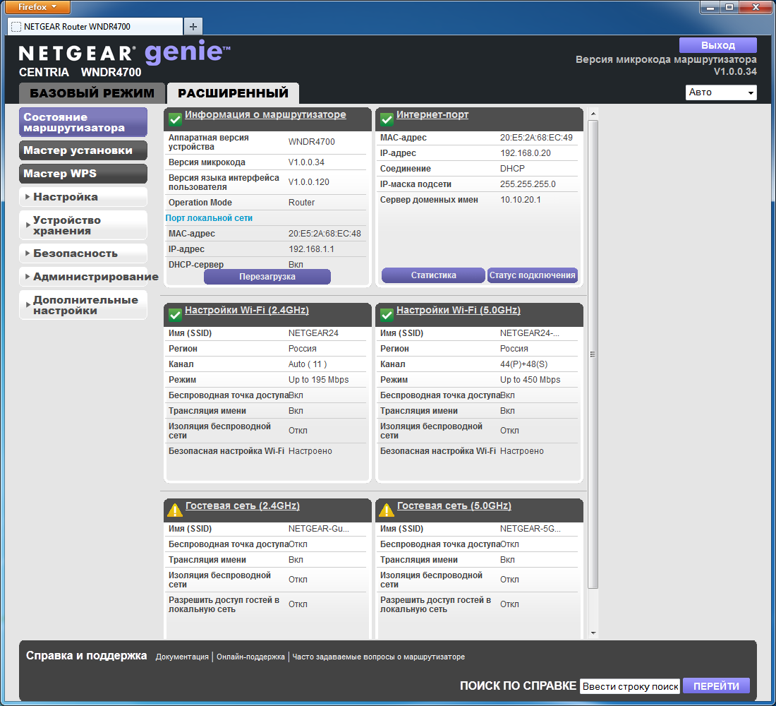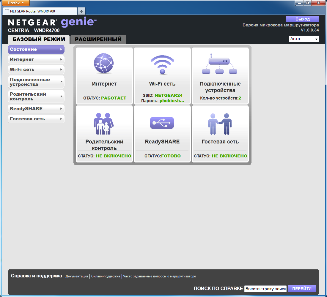 В прошивке предусмотрено два режима — «Базовый» и «Расширенный». Первый является упрощенной версией, ориентированной на начинающих пользователей, и предоставляет доступ лишь к основным настройкам системы, включая доступ к интернету, опциям беспроводной сети и работе сетевого накопителя. Также в нем имеется достаточно удобная страница состояния, на которой указывается статус основных компонентов системы.