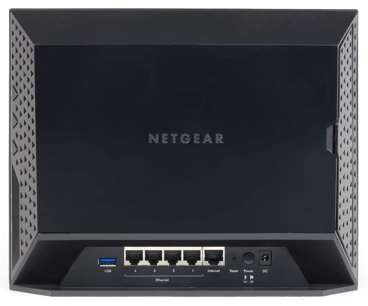 Что касается удобства подключения, то поставить однозначную оценку сложно. В относительно узкой нише сзади находятся: порт USB 3.0, пять сетевых портов (4 LAN + 1 WAN), скрытая кнопка сброса настроек, вход блока питания и выключатель. При использовании кабелей с защелками и дополнительным колпачками отключить их будет непросто. Жаль, что выбрали такой вариант в угоду дизайну; можно было бы попробовать вынести разъемы поближе к пользователю.