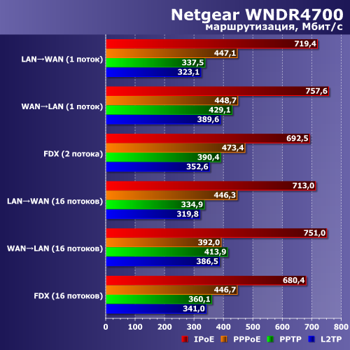 Но конечно, интересно, на что способна модель и на гигабитном подключении. К сожалению, этот вариант мы можем проверить только в синтетических тестах IxChariot. Первая диаграмма показывает скорость маршрутизации со всеми типами подключений — IPoE, PPPoE, PPTP и L2TP. Число потоков составляло 1, 2 или 16 в зависимости от теста.