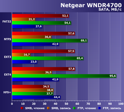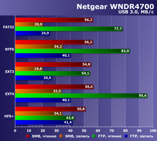 Скорость работы с разными файловыми системами и типами подключения приводится на следующих диаграммах. Использовался сценарий чтения и записи файла большого размера. Форматирование в NTFS осуществлялось средствами Windows 7, в EXT4 — роутером, в HFS+ — компьютером с Mac OS, для EXT3 и FAT32 применялась утилита gparted.