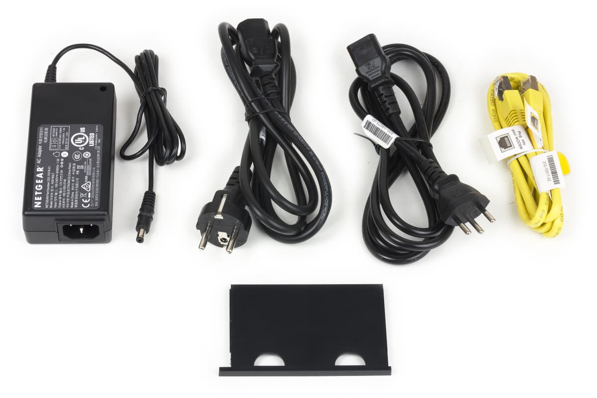 Блок питания модели имеет характеристики 12 В 5 А, так что проблем с питанием диска и внешних устройств не предвидится. Он достаточно крупный («ноутбучный») и комплектуется сетевым кабелем соответственно региону продажи. Также в коробке есть один гигабитный патч-корд, специальная вставка для установки тонких винчестеров, руководство по инсталляции и началу работы, компакт диск с электронной версией документации.