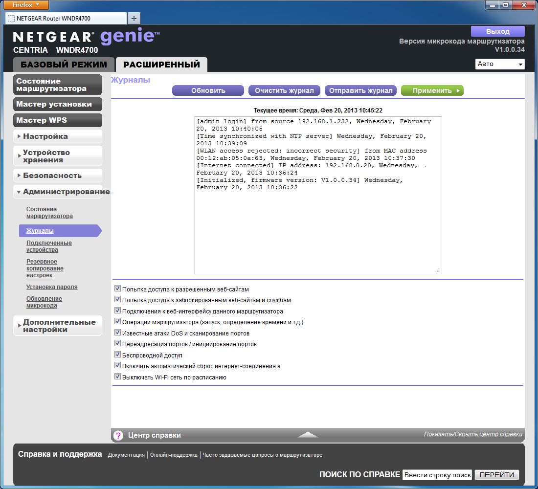 В разделе «Администрирование» собраны пункты для обновления прошивки (через интернет или из локального файла), сброса/сохранения/восстановление конфигурации, изменения пароля администратора. Также здесь есть журнал системных событий — к сожалению, он не отличается полнотой и удобством работы. Для удаленного контроля и архивирования можно использовать опцию регулярной отправки его по электронной почте.