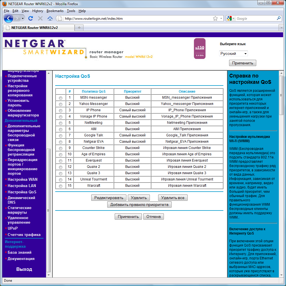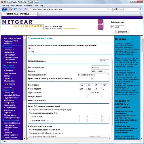 Никакого специализированного программного обеспечения для настройки или работы с устройством нет. Все операции осуществляются исключительно через web-брузер. Для доступа к web-интерфейсу необходимо на подключенном клиенте открыть страницу www.routerlogin.net. Далее будет предложено выбрать вариант настройки — с использованием помощника или для опытных пользователей. В первом случае роутер пытается самостоятельно обнаружить тип подключения (для прямого подключения может сработать, а вот локального провайдера роутер может и не опознать), настроить его, а потом указать параметры беспроводного подключения. Если же выбрать второй вариант — то вы сразу попадаете в привычный «полный» интерфейс устройства. Честно говоря, он нас немного удивил — не ждали таких возможностей от подобного недорогого устройства. Также надо отметить и то, что страницы локализованы и есть неплохо переведенная встроенная справочная система. Но обо всем по порядку. Тестирование проходило с прошивкой бета-версии V1.0.0.1_1.0.5.
