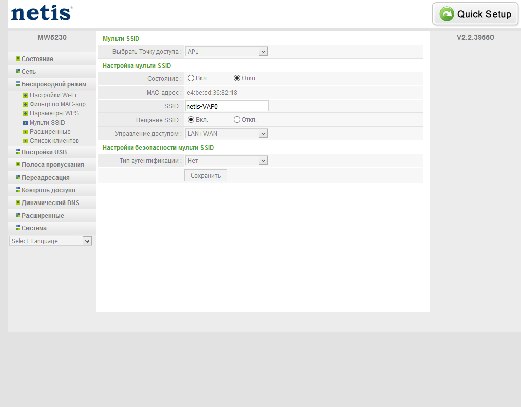 Для настройки используется традиционный веб-интерфейс. Для него предусмотрено несколько вариантов переводов, в том числе и на русский язык. Предусмотрен доступ через WAN, причем номер порта можно изменить. Протокол HTTPS устройство не поддерживает. Отметим наличие упрощенного «одностраничного» варианта настройки интернет-подключения и Wi-Fi. По умолчанию устройство создает защищенную беспроводную сеть, однако пароль стандартный.