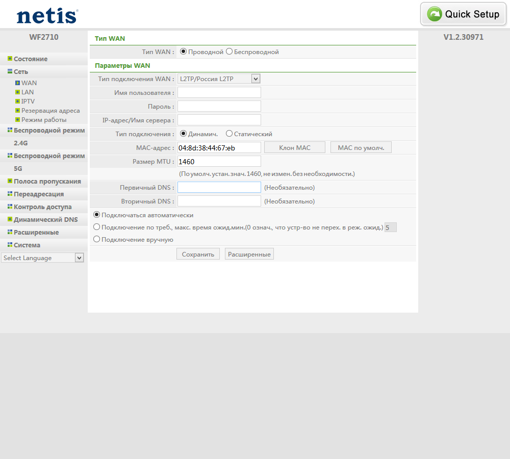 Для подключения к интернету по кабелю реализованы режимы IPoE, PPPoE, PPTP и L2TP. При работе через сервер доступа поддерживается и вторичное подключение для обмена данными с локальной сетью провайдера. Есть возможность изменения MAC-адреса порта WAN, выбор скорости его работы, установка размера MTU, клиент динамического DNS с парой сервисов, добавление пользовательских записей в таблицу маршрутизации, обработка трафика VPN с клиентов локальной сети.