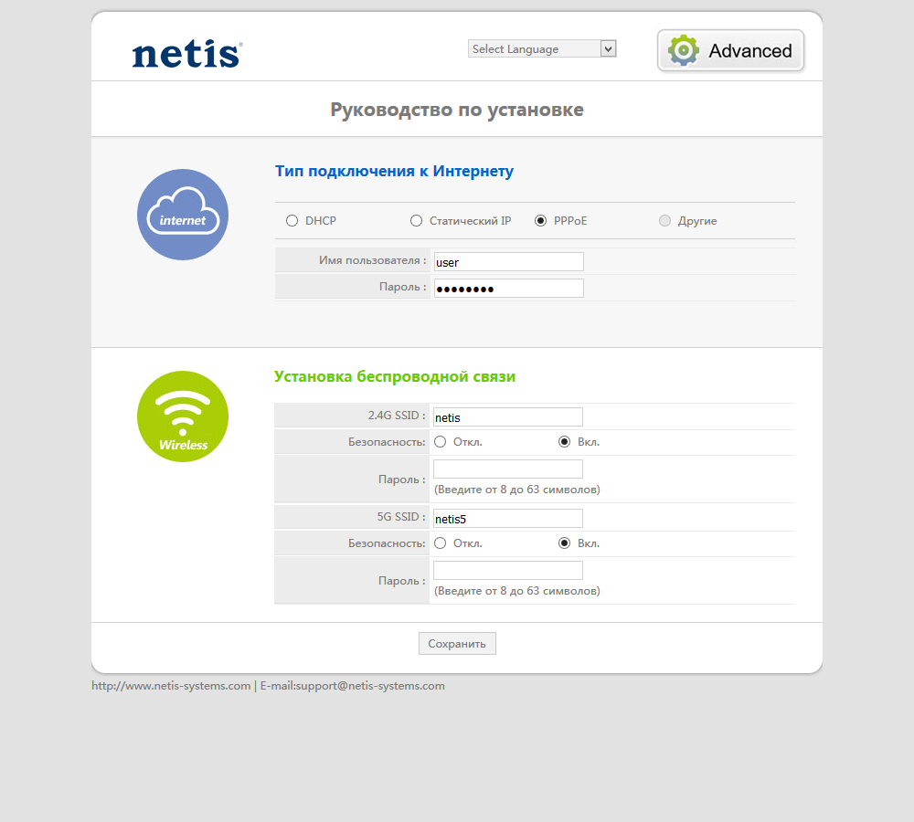 Предусмотрены упрощенный и полный варианты интерфейса. В первом случае, все умещается на одной странице — параметры подключения к интернету (кроме PPTP/L2TP), имена и пароли беспроводных сетей.