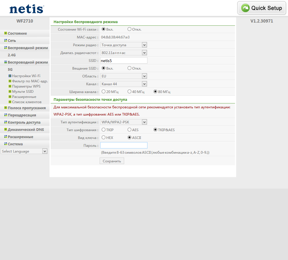Для настройки беспроводных точек доступа есть две группы страниц с похожим содержанием. Основные параметры стандартны: имя сети, стандарты, номер и ширина канала, защита (включая WPA и WPA2 с контрольной фразой). В диапазоне 5 ГГц устройство поддерживает только каналы 36—48.