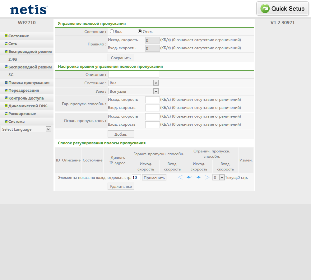 В роутере реализована система контроля полосы пропускания. После указания характеристик интернет-канала вы можете составить правила для отдельных адресов, диапазонов или подсетей, в каждом из которых записываются минимальные и максимальные значения для скоростей приема и передачи.