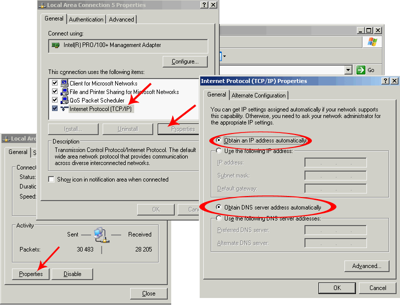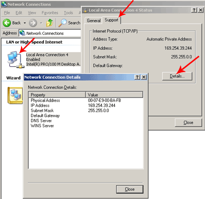 Для начала, проверим правильность установок IP-адресации у сетевой карты. По-умолчанию, ОС Windows (2K/XP) сама назначает нужные IP адреса картам, но лучше в этом убедится самим.