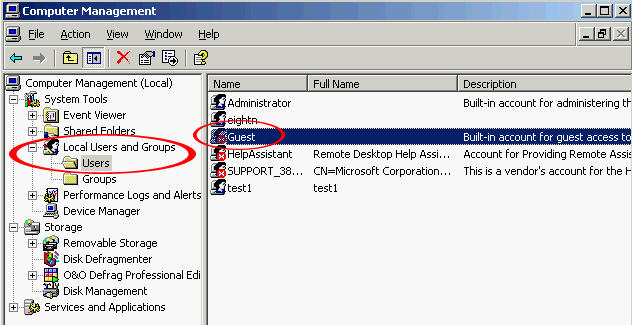 В появившемся окне управления компьютером выбираем закладку управления локальными пользоватлями и группами, находим гостевой (Guest) аккаунт и активируем его. По умолчанию в Windows гостевой аккаунт уже заведен в системе, но заблокирован.