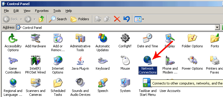 Идем в настройки сетевой карты. Это можно сделать двумя путями, через панель управления (Start —> Control Panel —> Network Connection)