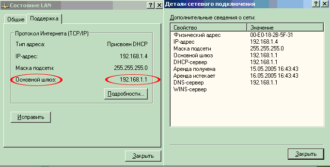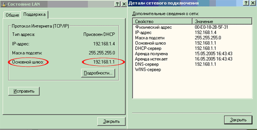 В появившемся окошке (окошко справа вызывается при нажатии на кнопку "подробности", но информация оттуда нас не интересует), нам нужна информация о IP адресе основного шлюза. Этот IP адрес и является адресом маршрутизатора.