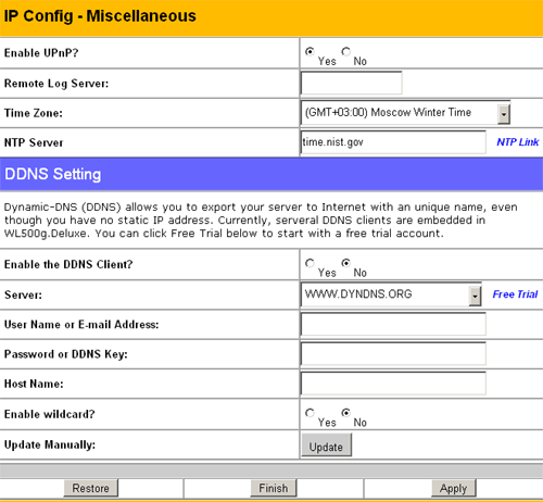 А также этот раздел позволяет подключиться к службе dyndns, которая позволяет получить клиенту статическое имя client_name.dyndns.org (или другое, в зависимости от провайдера услуги), которое будет ссылаться на выдаваемый клиенту IP адрес. Это удобно в случае, если клиенты получают внешние IP адреса (доступные из Интернет), но динамические, то есть, меняющиеся время от времени. В этом случае при смене адреса, сервис маршрутизатора уведомит dyndns о смене оного, и dyndns обновит ассоциацию client_name.dyndns.org