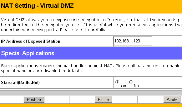 Virtual DMZ — это тоже нечто вроде виртуального сервера, но на данный IP (в нашем случае 192.168.1.123) перенаправляются все запросы (за исключением тех, что указаны в разделе виртуальных серверов), приходящие на внешний (WAN) интерфейс маршрутизатора.
