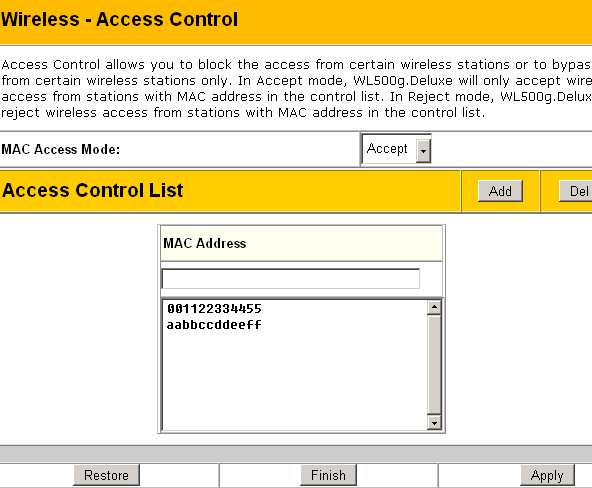 В закладке Wireless -> Access Control можно дополнительно увеличить безопасность беспроводного соединения, путем строгого задания списка MAC адресов беспроводных клиентов, которым разрешено работать с нашей точкой доступа. Достаточно внести туда все MAC адреса наших беспроводных адаптеров и в разделе "Mac Address Mode" указать Accept (то есть работаем только с теми MAC-ами, что есть в списке, остальные игнорируем).