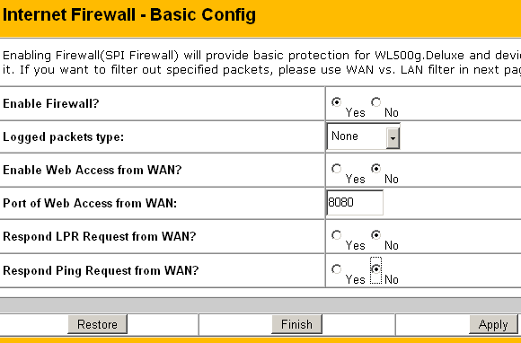 Последний рассматриваемый раздел — Internet Firewall. Вообще, внутренняя (LAN) сеть уже не видна внешнему миру, так как находится за NAT-ом. Но маршрутизатор-то по-прежнему виден. Этот раздел позволяет спрятать и маршрутизатор. Остановимся на основных опциях: