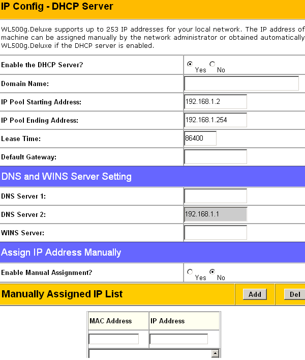 Чуть ниже в разделе "Manually Assigned IP List" можно жестко привязать IP адрес к MAC адресу, чтобы для конкретного MAC выдавался всегда один и тот же IP. Это нужно в случаях, когда внутри сети стоят какие-то сервисы (сервера), которые видны снаружи (из Интернет), тогда их IP адреса должны быть фиксированы, чтобы прописать на них правила в разделе виртуальных серверов (об этом чуть ниже).