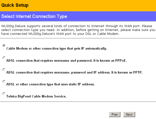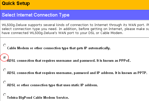 После нажатия кнопки NEXT, мы покинем режим ветвления (разные настройки для разных типов Интернет-соединений) и перейдем к настройкам беспроводной части маршрутизатора. О нем чуть ниже, сейчас же вернемся к экрану, где нам предлагают выбрать тип Интернет соединения.