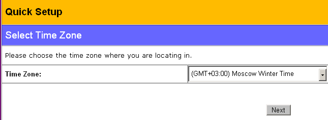 На первом шаге нам предлагают выбрать часовой пояс. К слову сказать, эта опция доступна не на всех маршрутизаторах (тем более в режиме wizard-а).