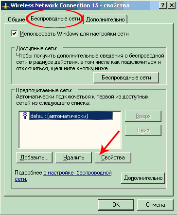 Но если вдруг потребовалось, переходим в закладку "беспроводные сети", выбираем профиль нужной нам сети и жмем на кнопку "свойства".